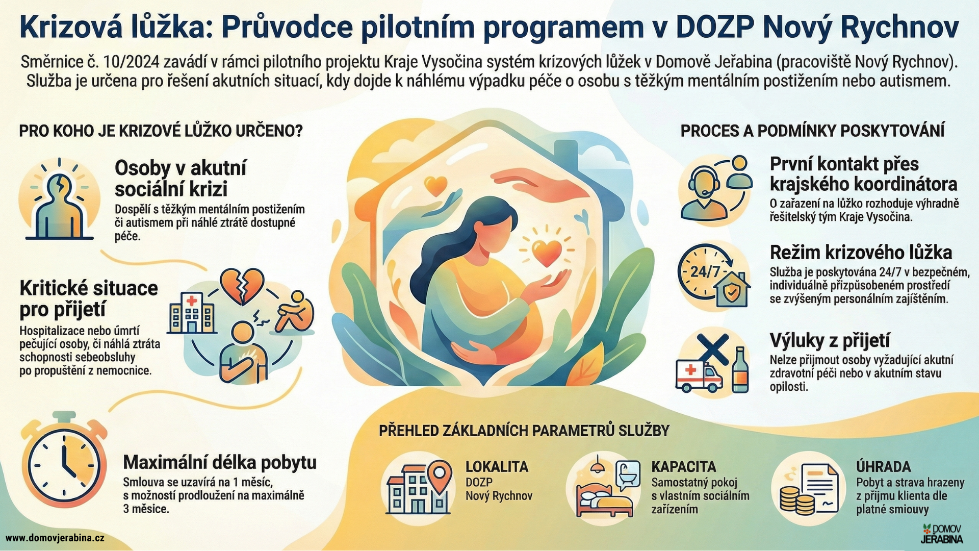 Od 1. 2. 2024 bylo poskytováno 1 lůžko pro osoby v krizi, v rámci sociální služby domovy pro osoby se zdravotním postižením (s cílovou skupinou: osoby s jiným zdravotním postižením - osoby s mentálním, se specifickými diagnózami a autismem, osoby s mentálním postižením), a to za účelem pilotního ověření provozu v souvislosti s realizací klíčové aktivity 2 projektu: Rozvoj a podpora procesů pro zkvalitnění poskytování služeb sociálně zdravotního pomezí v Kraji Vysočina, reg. č. CZ.03.02.02/00/22_006/0000953, spolufinancovaného Evropskou unií.