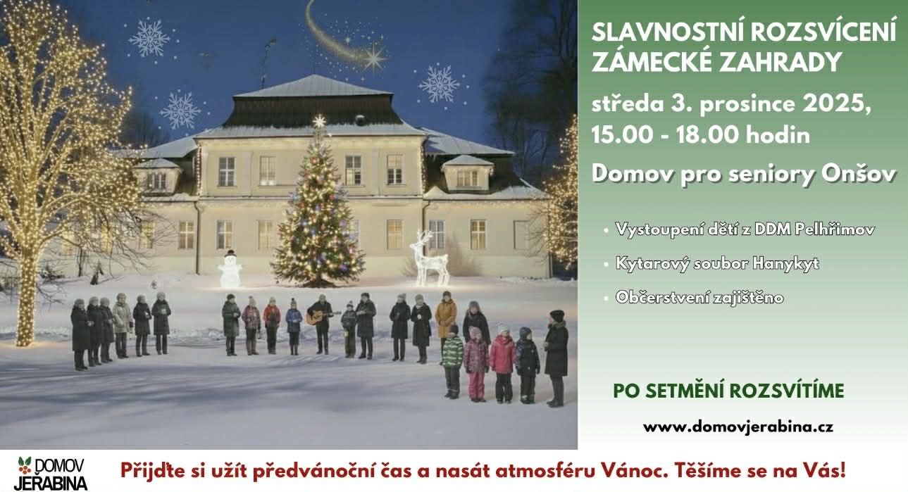 Zaměstnanci napnuli všechny síly, aby mohli obyvatelům i návštěvníkům nabídnout něco, co Domov pro seniory Onšov ještě nezažil. Ve středu 3. prosince od 15:00 se zahrada, která byla v posledních letech revitalizovaná a stala se oblíbeným cílem, rozzáří v celé své kráse. V uplynulých dnech se chystala a ladila výzdoba, světelné dekorace i doprovodný program. Během středečního odpoledne, na které je zvána i široká veřejnost, vystoupí děti z DMM Pelhřimov a o hudební doprovod se postará kytarový soubor Hanykyt. Chybět nebude ani adventní občerstvení a pro návštěvníky je připraveno malé překvapení. Do příchodu Ježíška přece zbývají už jen necelé tři týdny. „Srdečně zveme všechny přátele, rodiny i širokou veřejnost do zámeckých zahrad našeho zařízení. Přijďte s námi prožít hezké předvánoční odpoledne,“ dodává ředitel Domova Jeřabina Aleš Urban. Pozvánku najdete pod článkem.