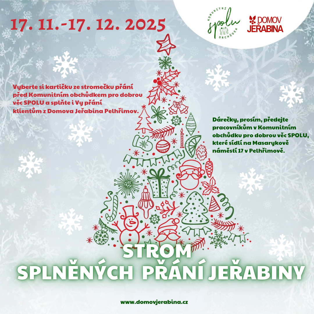 Slavnostní instalace stromu proběhla v předposledním listopadovém týden. Strom splněných přání veřejnost najde před Komunitním centrem s obchůdkem pro dobrou věc, které je otevřeno v psaníčkovém domě č.p. 17 na Masarykově náměstí v Pelhřimově. Na jeho větvích jsou zavěšeny kartičky s konkrétními vánočními přáními klientů Domova Jeřabina. Každý si může vybrat to, které mu je nejbližší, a splnit ho. „Každé přání, ať už malé nebo velké, má pro naše klienty obrovský význam. Je to pro ně důkaz, že na ně někdo myslí a že jejich radost je důležitá. V předvánočním čase má tato akce pro nás i naše klienty zvláštní, téměř kouzelný rozměr,“ říká ředitel Domova Jeřabina Aleš Urban. Přání jsou velmi různorodá. Od praktických věcí až po sladkosti, knihy či malé radosti, které zpříjemní každodenní život. Vybraný dárek stačí donést zpět do Komunitního centra s obchůdkem pro dobrou věc, odkud poputuje přímo do příslušné domácnosti. Klienti si dárky rozbalí na Štědrý den pod svými vánočními stromečky. Akce trvá do 17. prosince, takže každý má ještě dostatek času zapojit se a přispět k vánoční radosti. „Strom splněných přání Jeřabiny vytváří sváteční atmosféru a připomíná nám všem, jak moc mohou malé skutky potěšit a spojit lidi v duchu laskavosti. Děkujeme každému, kdo se zapojí a pomůže vytvořit našim klientům nezapomenutelné Vánoce,“ uzavírá Urban.