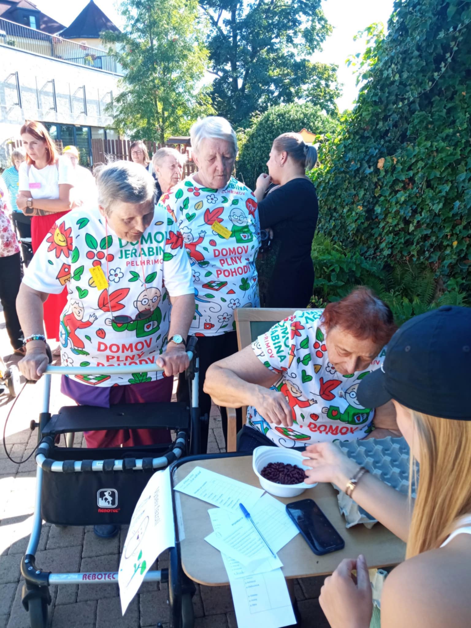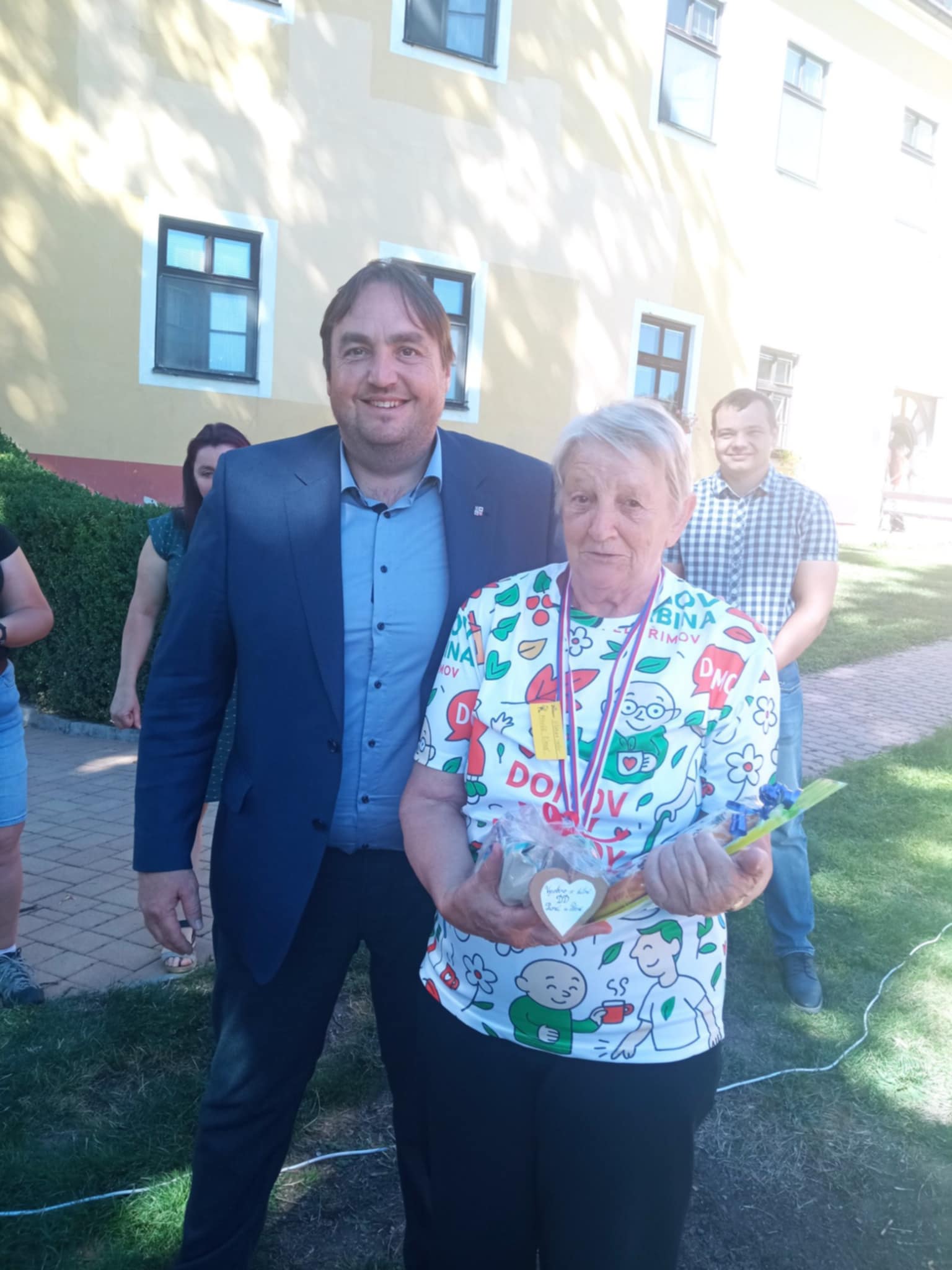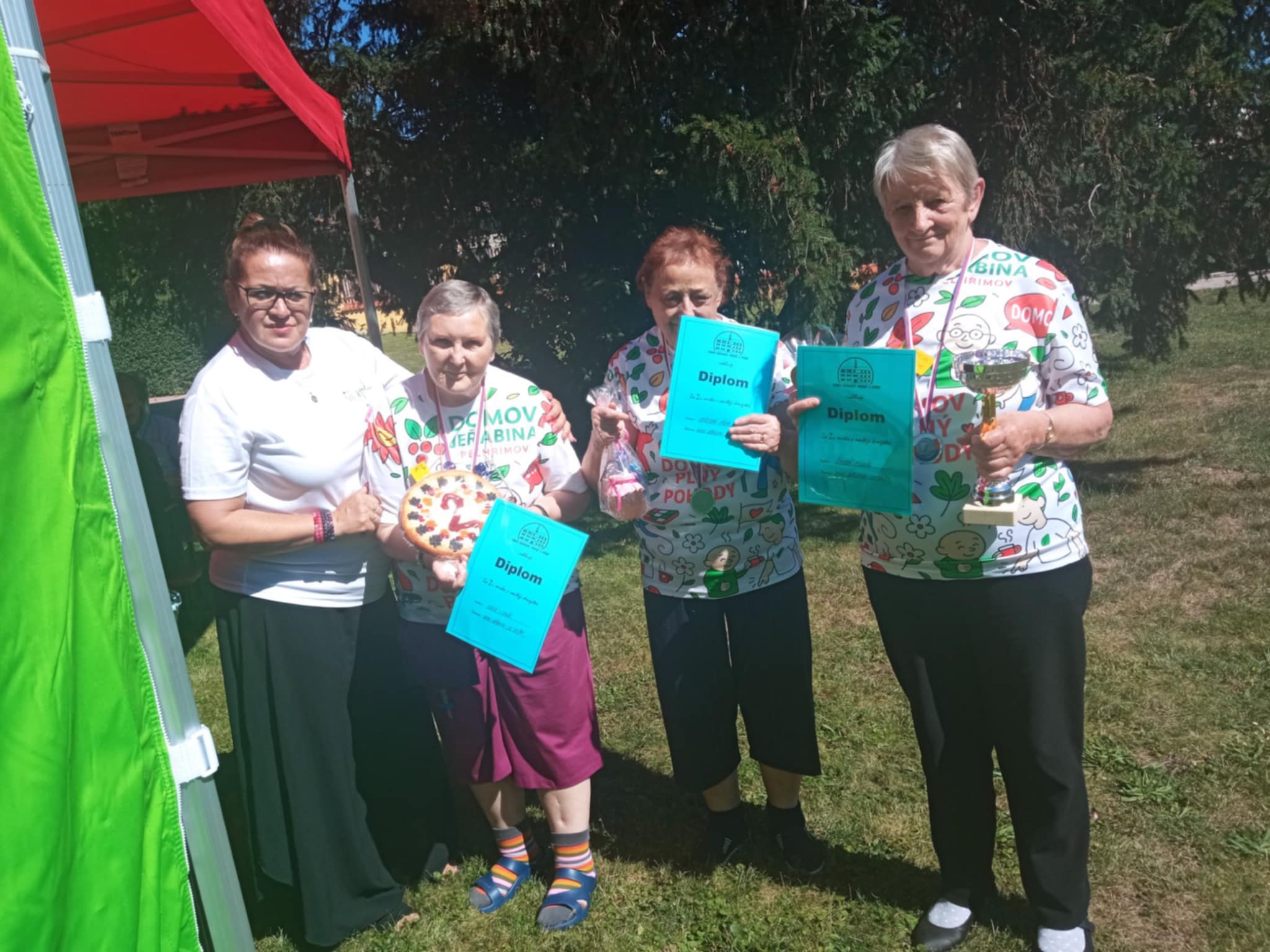 Posbírat jablka, pochytat ryby, sklidit mrkev nebo uklidit dříví. Takové disciplíny čekaly na účastníky 24. ročníku Prosečkiády, kterou pořádal Domov důchodců Proseč. Do tradičního klání se zapojilo osm zařízení sociální péče, mezi nimi i obyvatelé Domova pro seniory Onšov. Fandit přijel také radní Kraje Vysočina pro sociální oblast Jiří Horký. Z jeho rukou převzala zlatou medaili obyvatelka Domova pro seniory Onšov paní Miluška Šímová, která obhájila loňské vítězství v kategorii jednotlivců. Onšovský tým v nepřehlédnutelných tričkách navíc vybojoval 2. místo mezi družstvy. „Radost soutěžících byla nepopsatelná. Je skvělé vidět, že i v pokročilém věku si lze užít chvíle naplno a ukázat, že věk je jen číslo. Děkuji všem, kteří se podíleli na organizaci a pomohli udělat z této akce nezapomenutelný zážitek,“ uvedl ředitel Domova Jeřabina Aleš Urban, který přišel soutěžící osobně povzbudit. Odměnou pro všechny bylo bohaté občerstvení a připravený oběd. Velké poděkování patří nejen hostitelskému zařízení, ale také studentům Gymnázia Pacov, kteří pomáhali na stanovištích a podporovali soutěžící. Onšovské reprezentantky potěšila i návštěva Aleše Urbana přímo v Domově pro seniory Onšov. Přivezl jim kytičku a tričko s logem Domova Jeřabina jako milou památku na skvělý výkon. „Jste inspirací pro ostatní,“ vyzdvihnul ještě jednou ředitel Domova Jeřabina.